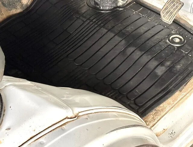 お預かりした際、運転席足元のマットには土埃や落ち葉が目立ち、長年蓄積された汚れがしっかりと付着していました。
