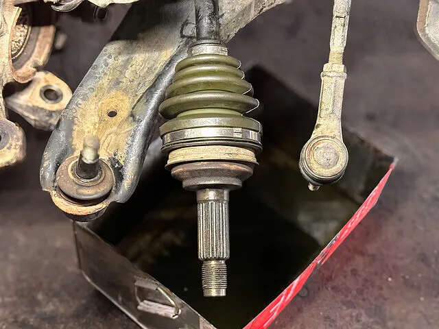 点検時、ドライブシャフトブーツ部分に破れが見つかり、グリス漏れによる錆や汚れも確認できました。