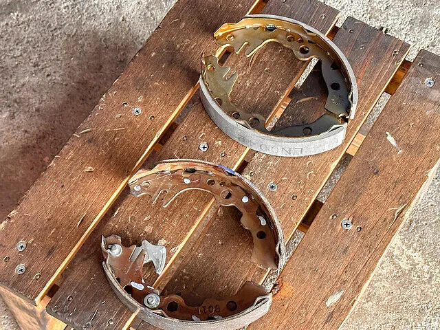 回転しているドラムの内側に、三日月形の板を内側からギュッと押し当てて車を止めるという仕組みになっており、二枚目の写真にある三日月形のものが「ブレーキシュー」です。